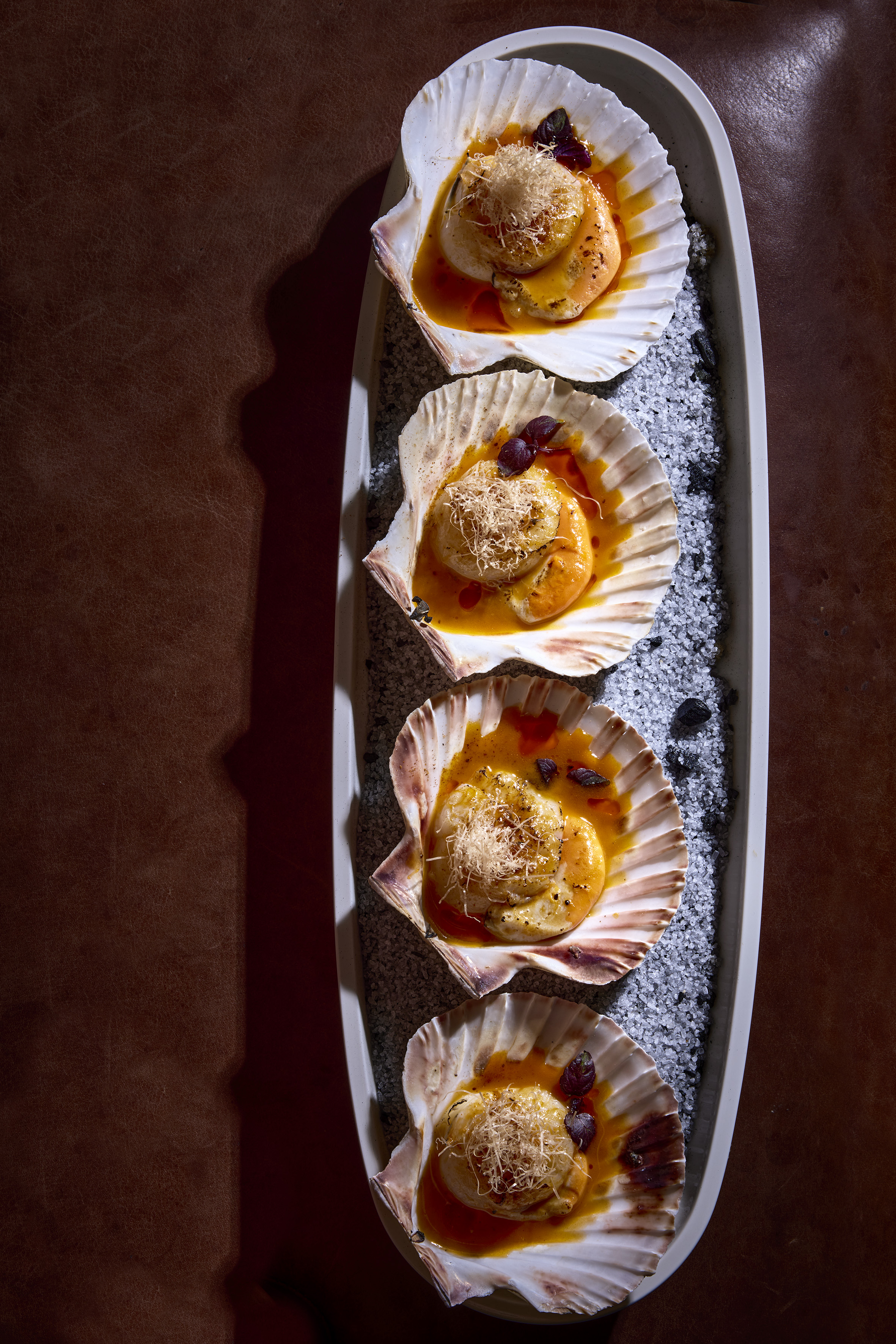 A la robata coronado con chips de ajo, micro shiso y sal Maldón, acompañado con ponzu yuzu.